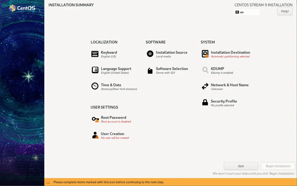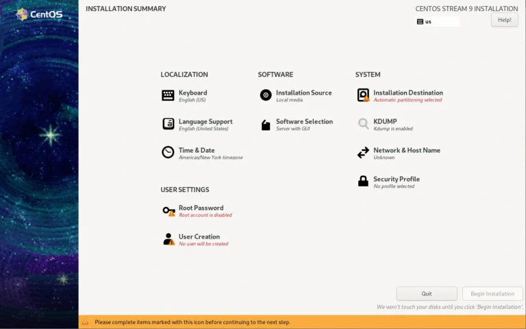 3. หน้าจอ Installation Summary ปรากฏขึ้น จะเห็นเครื่องหมายเตือนหรือตกใจปรากฏอยู่ คลิกหัวข้อที่ต้องการกำหนดค่า เช่น คลิก Root Password