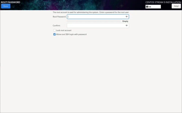 4. ใส่รหัสให้ตรงกันทั้งสองช่อง คลิกเลือก Allow root SSH login with password และคลิก Done