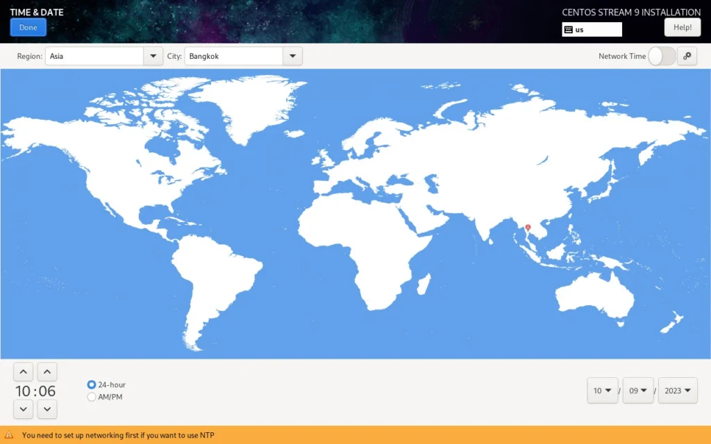 5. คลิกหัวข้อ Time & Date สามารถคลิกแผนที่ประเทศไทย หรือเลือก Region : Asia และ City: Bangkok ได้ หากเวลาไม่ตรงให้ปรับแต่งให้ถูกต้อง และคลิก Done