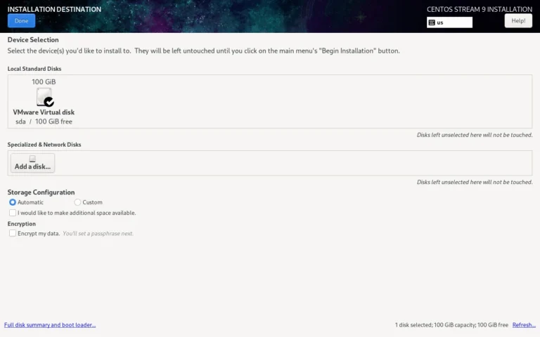 6. คลิกหัวข้อ Installation Destination สามารถปรับแต่ง Drive หรือ Partition ในการติดตั้งระบบปฏิบัติการได้ตามต้องการ หรือคลิก VMware Virtual disk และคลิก Done เป็นการสร้างแบบอัตโนมัติ