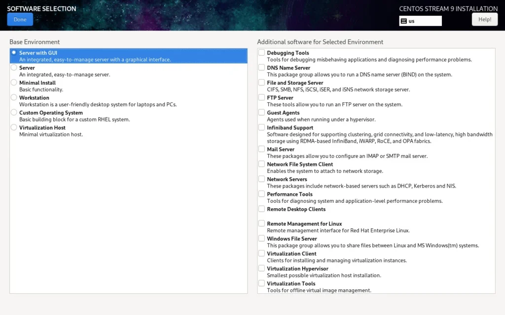 โดยทุกรูปแบบการติดตั้งระบบปฏิบัติการสามารถคลิกเลือกซอฟร์แวร์ที่ต้องการเพิ่มเติมได้ (จะไม่ติดตั้งตอนนี้ก็ได้ แล้วติดตั้งภายหลัง) และคลิก Done