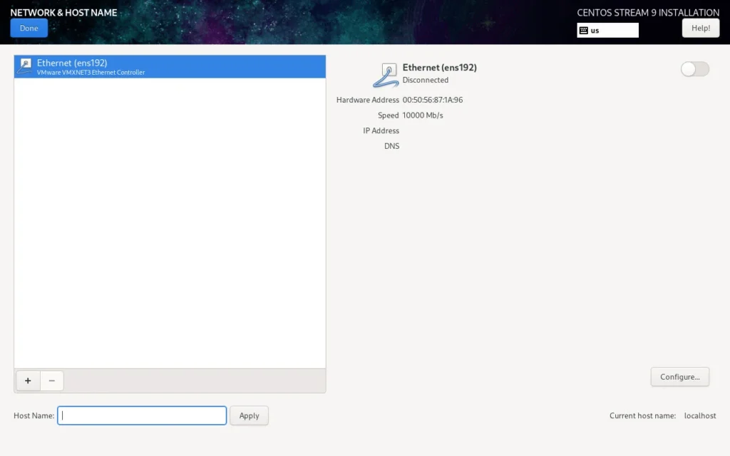 9. คลิกหัวข้อ Network & Host Name ด้านขวาบน ให้เลื่อนสไลด์ไปด้านขวา เพื่อ Connected เครือข่าย และคลิก Configure…