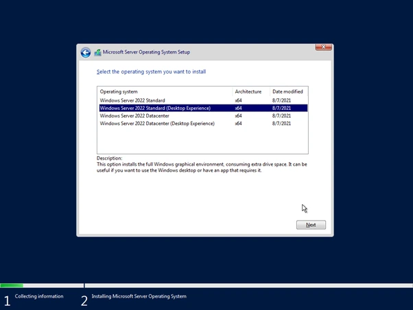 4. เลือก Windows Server 2022 Standard หรือ Datacenter ตัวเลือก Desktop Experience เป็นการทำงานแบบกราฟฟิค (GUI)