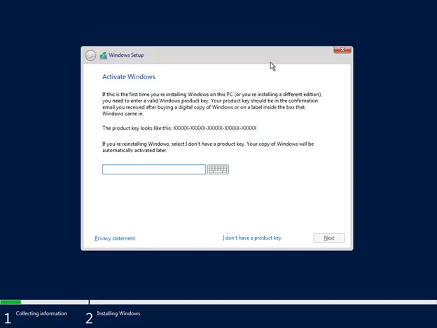 3. กรอก Product key คลิก Next หรือคลิก I don’t have aproduct key เพื่อทดสอบ และสามารถใส่ภายหลังได้